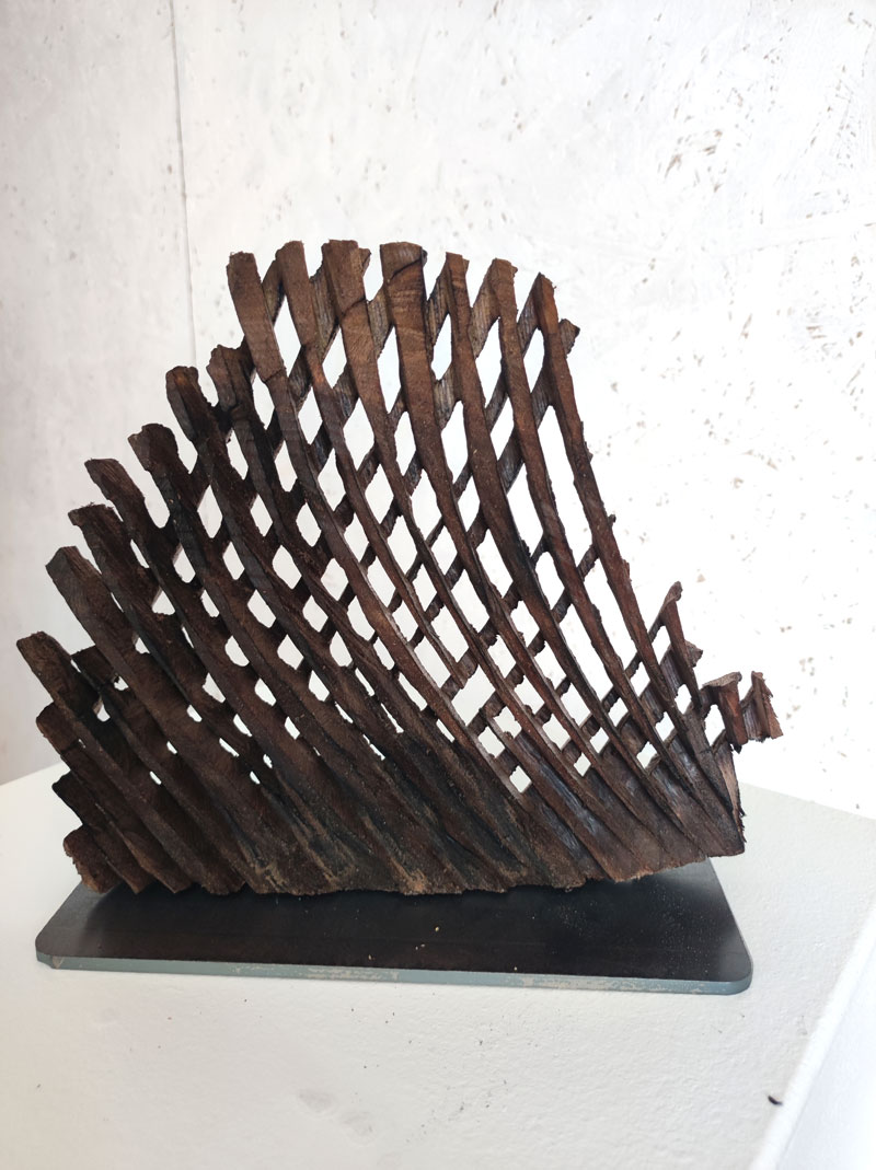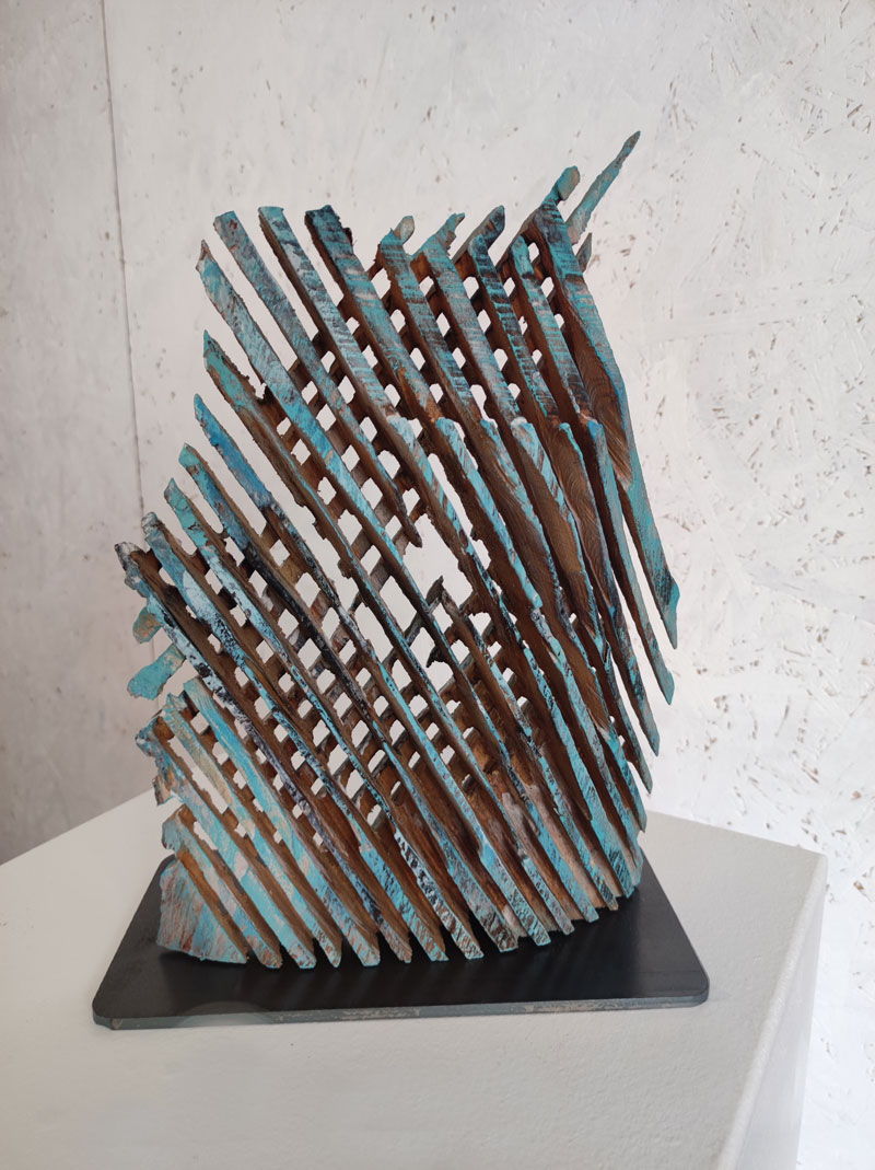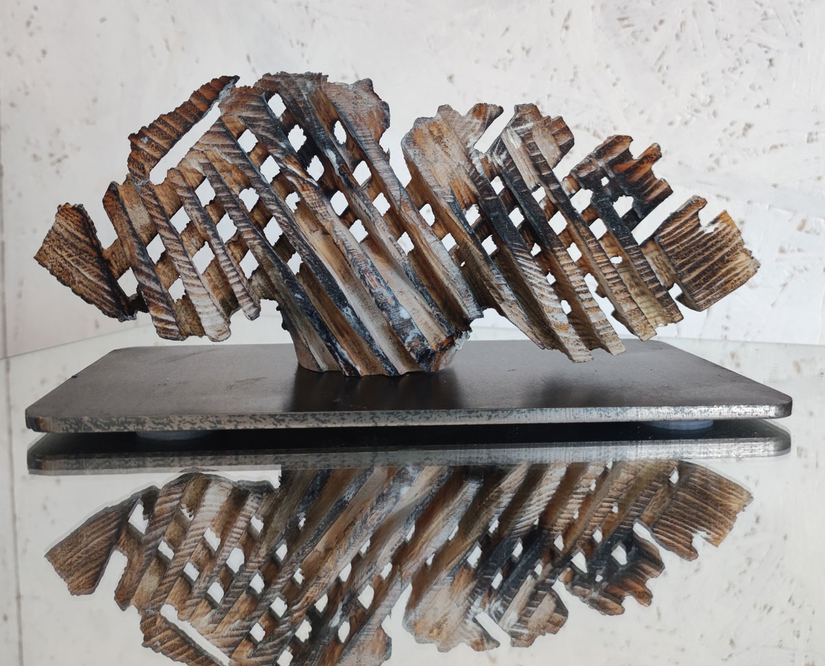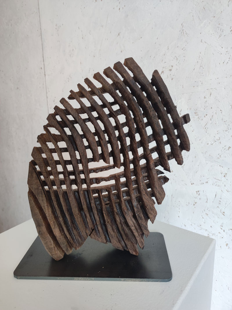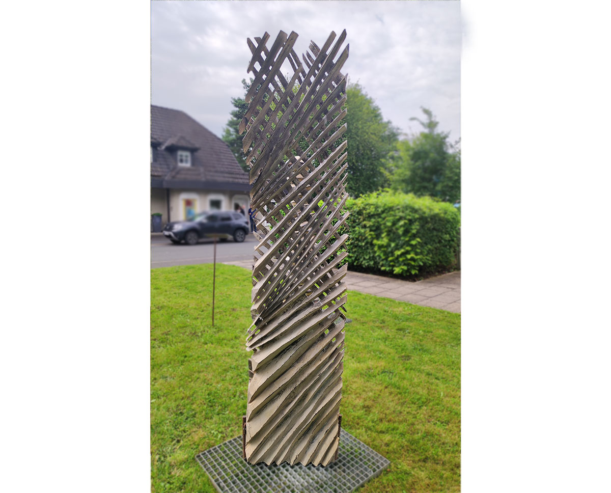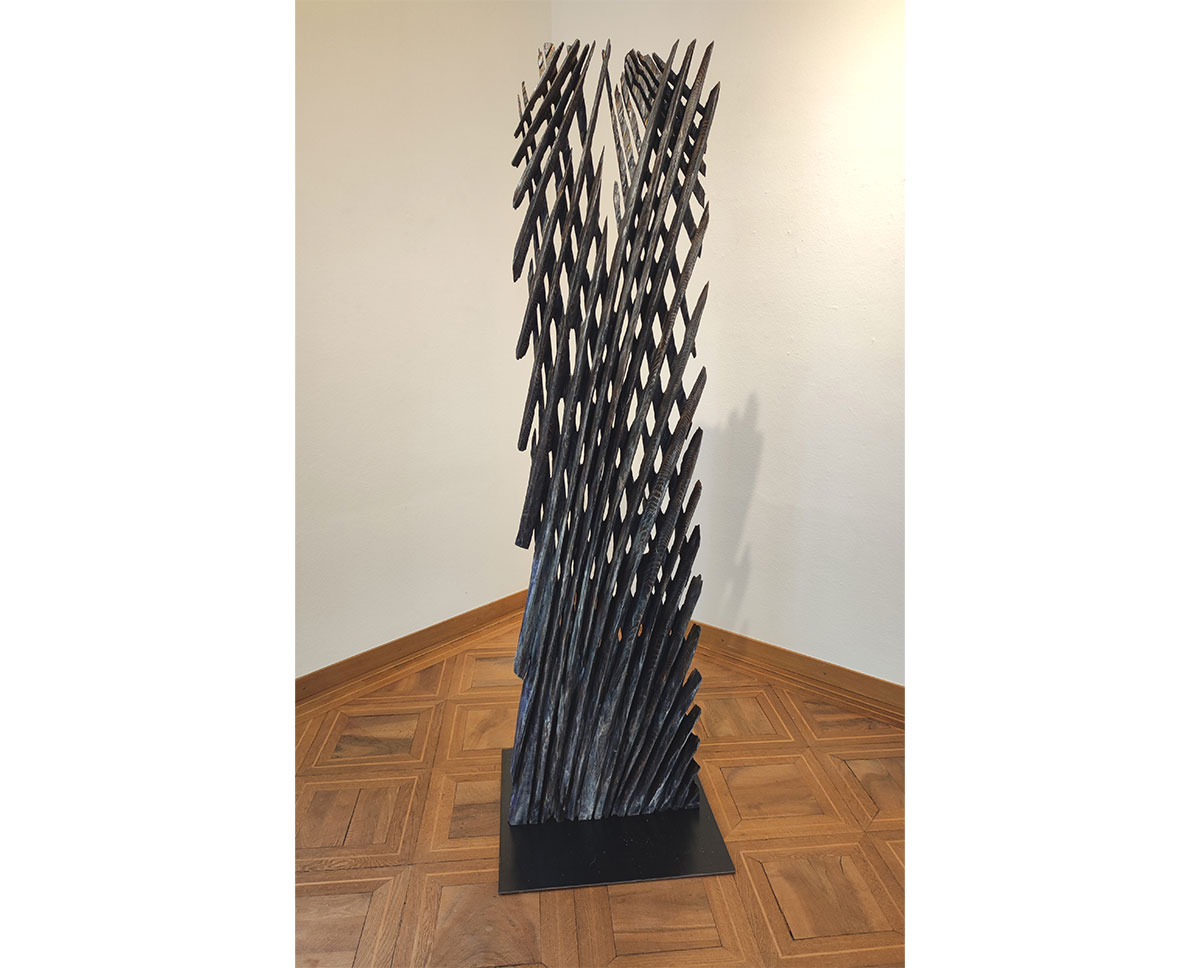 Die filigranen Skulpturen aus der Serie „Rhythmus“ thematisieren den ganz eigenen, persönlichen Lebensrhythmus eines Individuums. Sie werden durch eine genau bemessene Gewichtung der Massen ins Lot gesetzt und wirken so fein und zerbrechlich wie die Skelettstruktur eines Blattes. Ist ein zuverlässiges Skelett nicht die perfekte Metapher für die Stabilität und Widerstandsfähigkeit eines Individuums? Ein solides Gebilde aus gegenläufigen Streben, das die Freiräume einzurahmen, ja sogar zu halten scheint. Den Zwischenräumen kommt ebenfalls Bedeutung zu – sind sie doch entscheidend für die Ausdruckskraft.